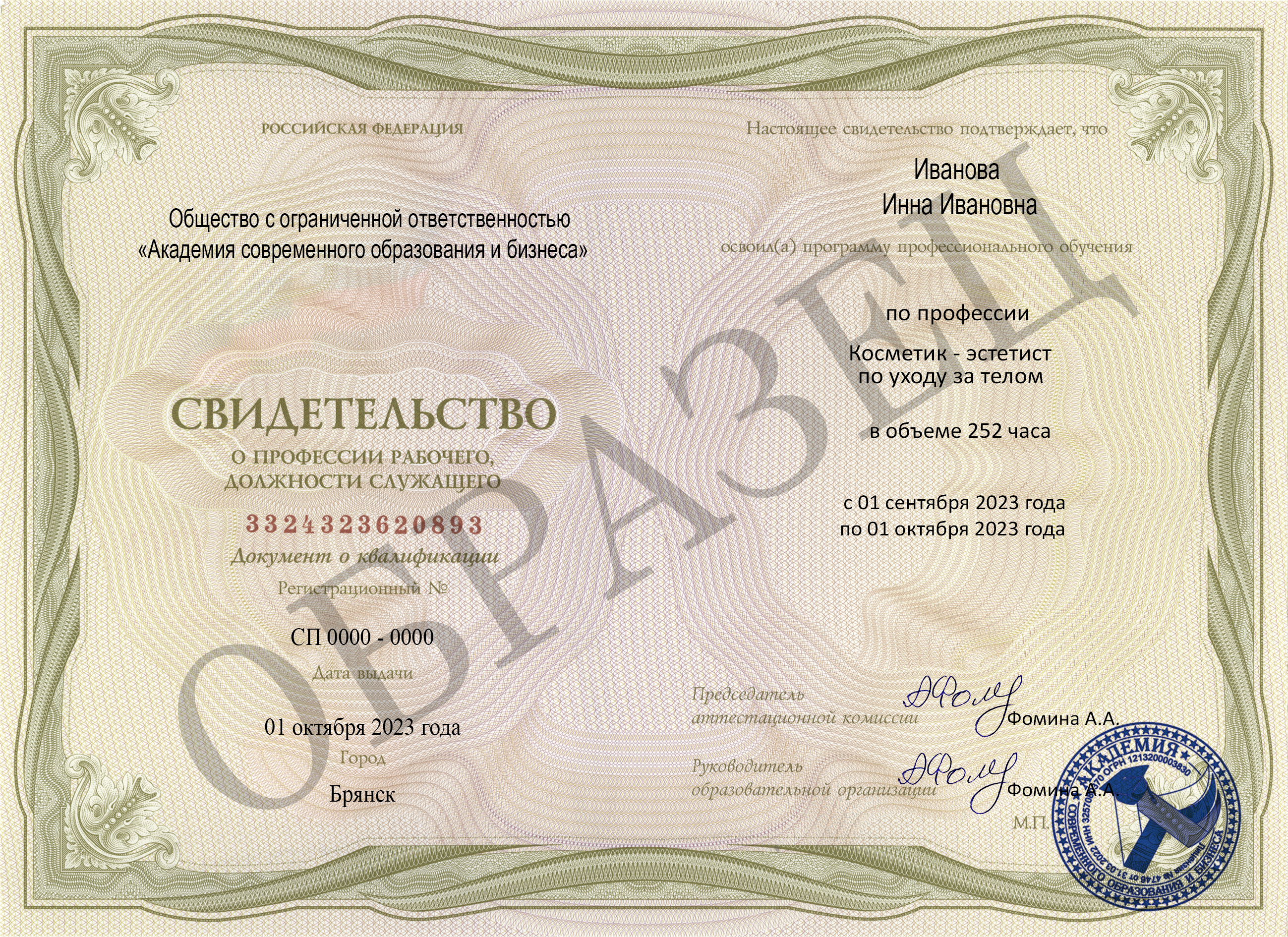 Официальный документ государственного образца "Косметик-экстетист по телу" после выполнения всех заданий и демонстрации результатов