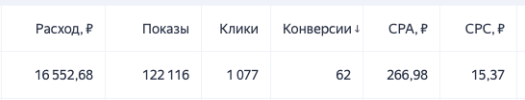62 заявки по 266,98 руб при расходах всего 16552,68