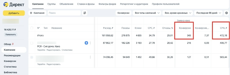 Это скриншот из рекламного кабинета Яндекс Директ. Здесь видно 343 заявки по 472, 18 руб